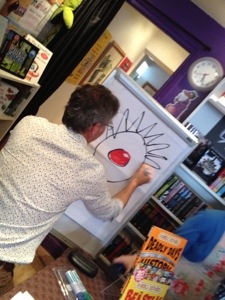 Not only did Martin sign books, posters and Rattus stickers, he also spent time talking to all of our visitors. The rather bizarre creation pictured above was drawn by Martin, who asked the children for suggestions to create a character. So now we have a weird and wonderful original Martin Brown drawing. Yay!
